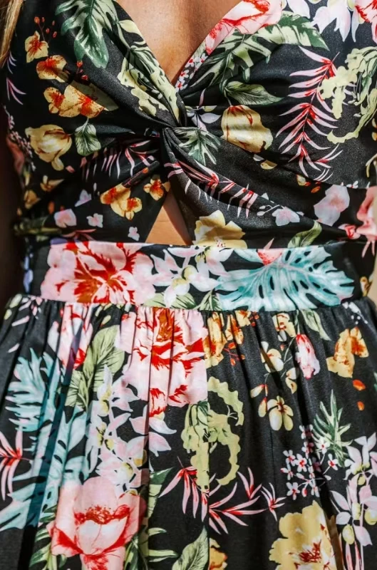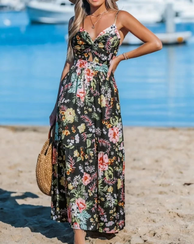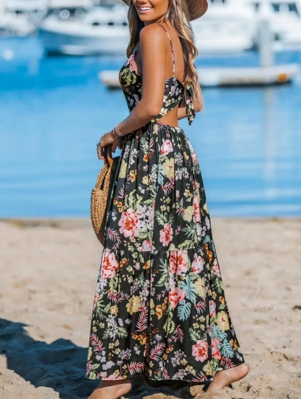 Factory Ladies' Eco-Friendly Summer Floral Chiffon Maxi Dress Halter Neck Natural Back Lace Pastoral OEM Service Available
